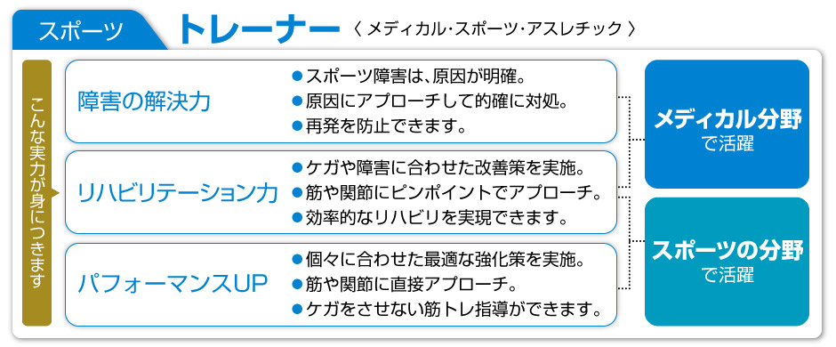 ひと口にトレーナーになるといっても現在は、スポーツトレーナー、メディカルトレーナー、アスレチックトレーナーの三種類があります。みなさんは、どれをめざしますか?